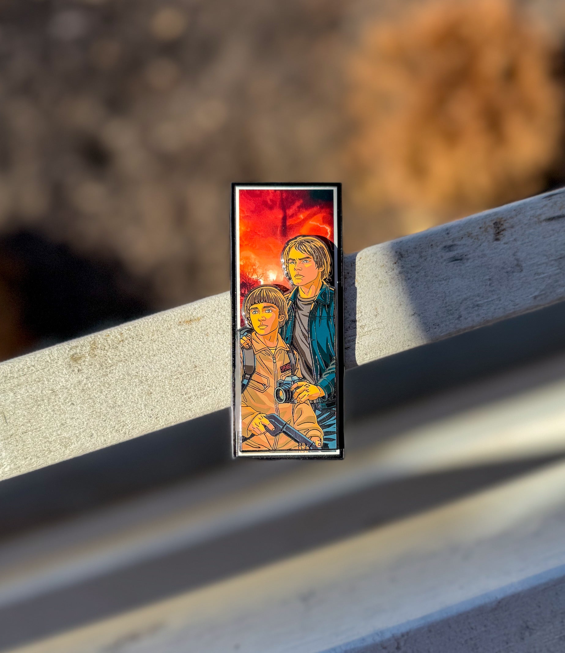 The Eras pins are about 3.75 inches tall, black nickel, and pin on pin. They could work next to each other as a set or for individual displays/use.