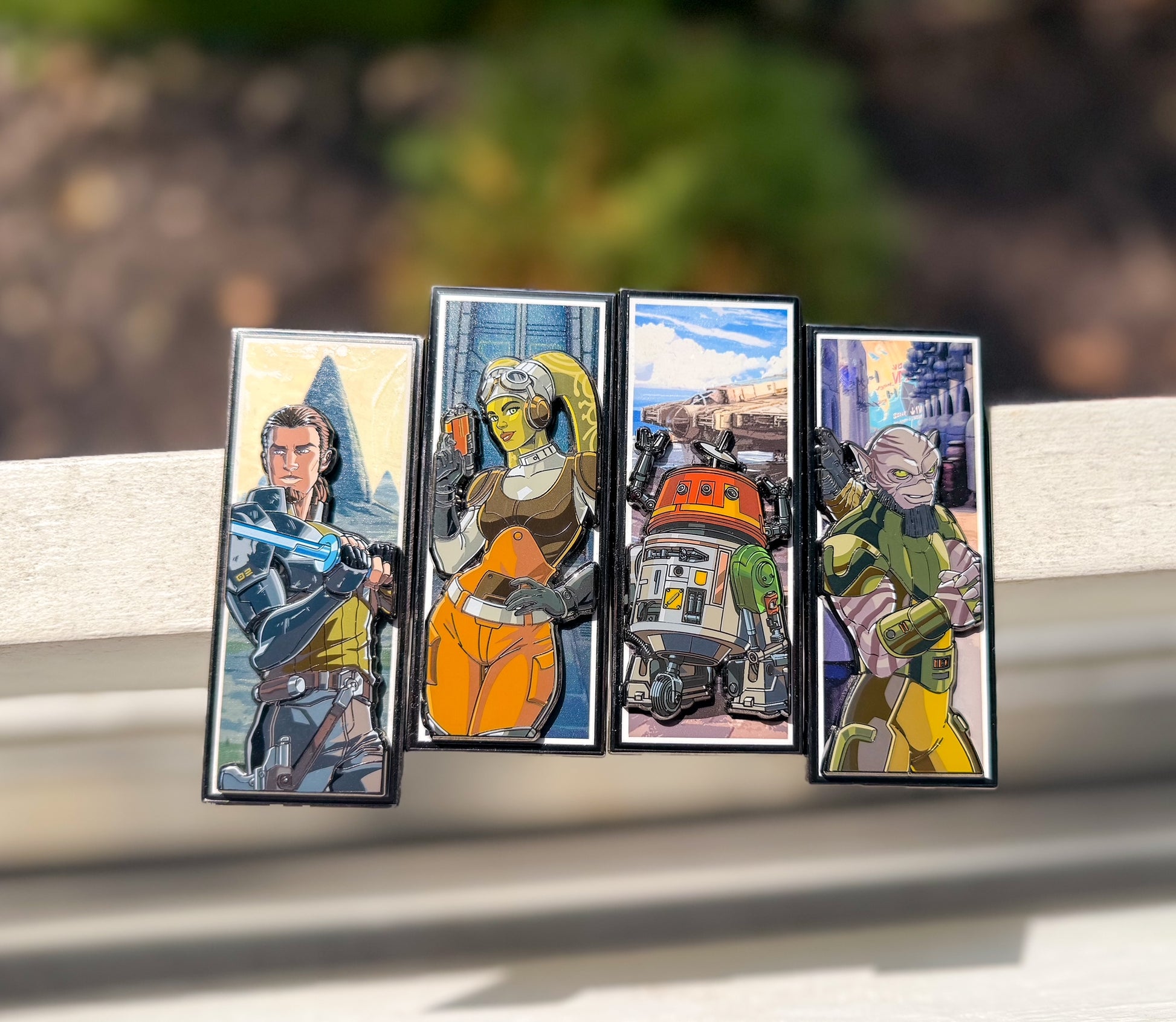 The Eras pins are about 3.75 inches tall, black nickel, and pin on pin. They could work next to each other as a set or for individual displays/use.