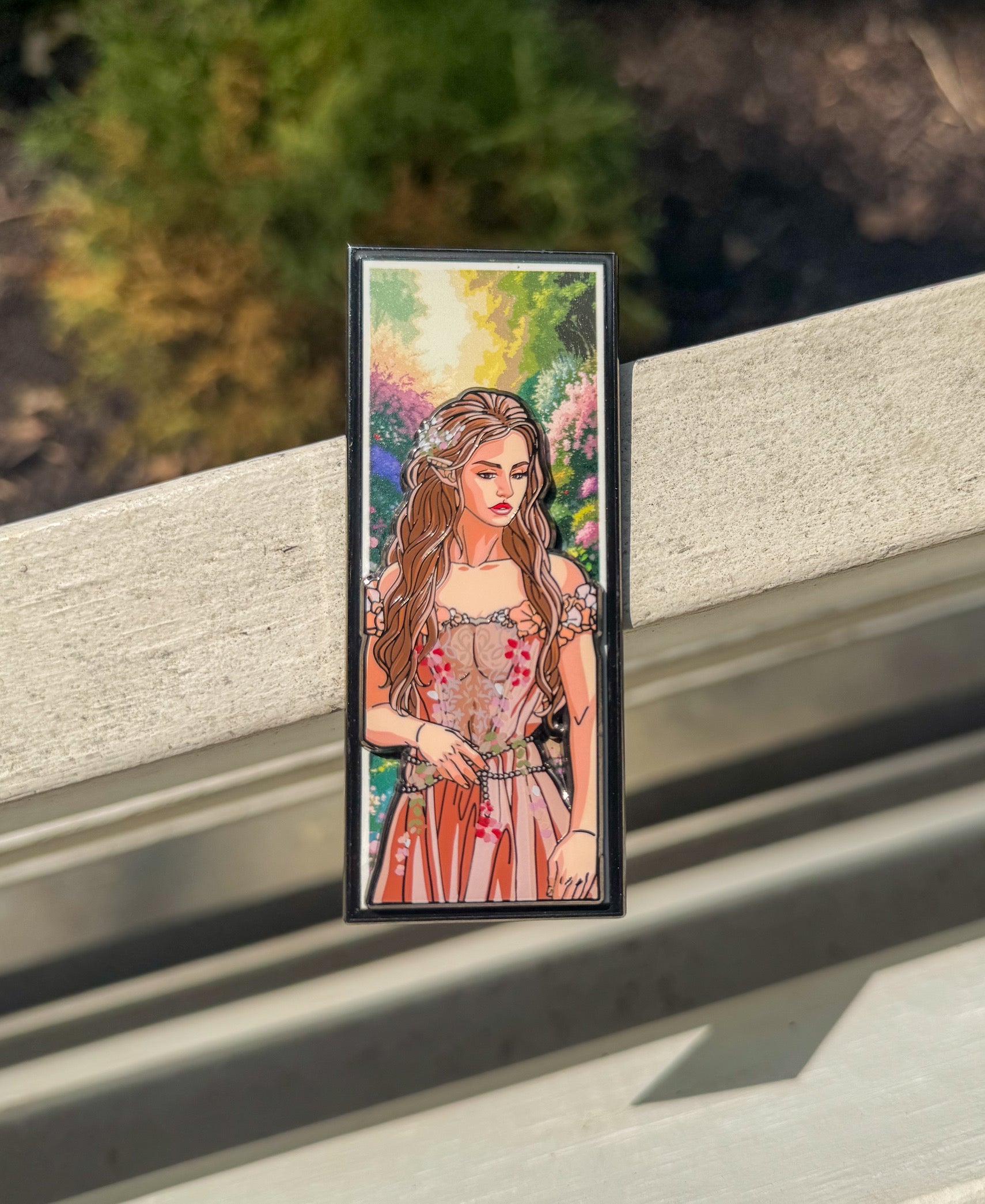 We can find Elain surrounded by flowers in her garden. The Eras pins are about 3.75 inches tall, black nickel, and pin on pin. They could work next to each other as a set or for individual displays/use.