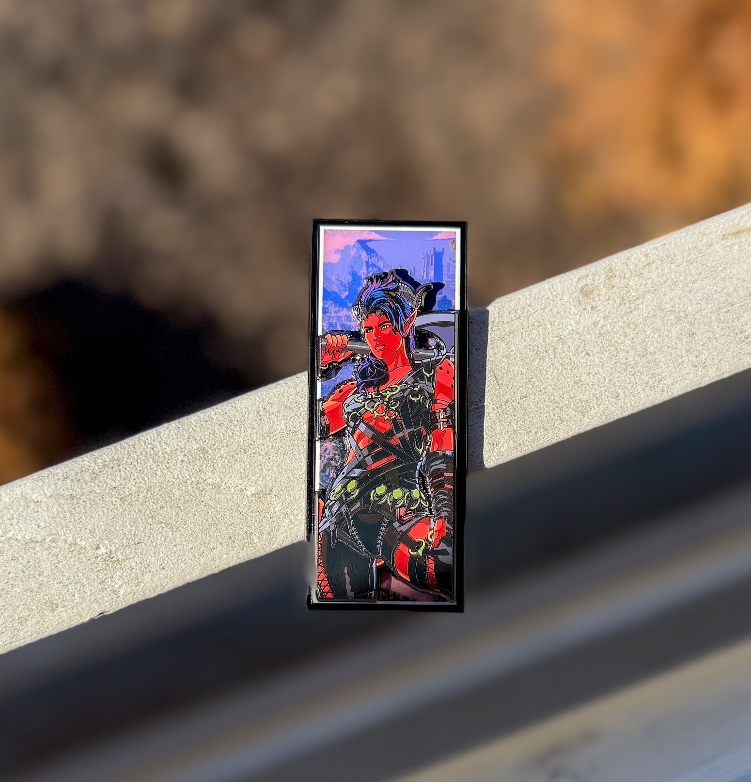 The Eras pins are about 3.75 inches tall, black nickel, and pin on pin. They could work next to each other as a set or for individual displays/use.